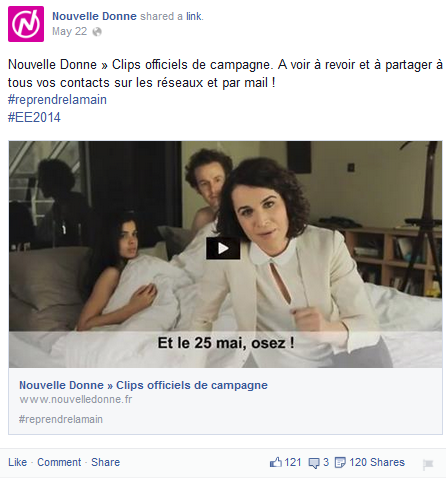 Pendant les élections européennes, le compte facebook mobilise les sympathisants et les électeurs avec un lien vers une vidéo présente sur la chaîne youtube de Nouvelle Donne.